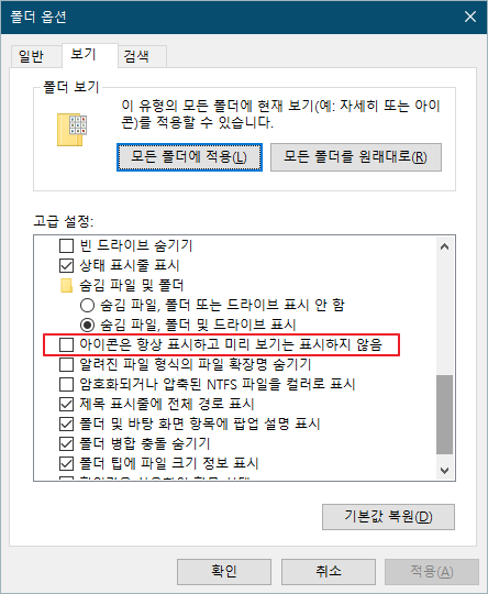 '아이콘은 항상 표시하고 미리 보기는 표시하지 않음' 부분 체크해제